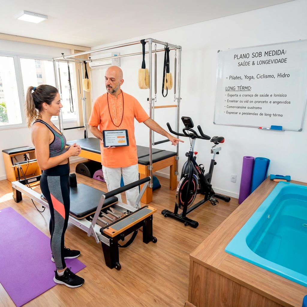 Isso pode envolver Pilates, hidroginástica, ciclismo, Yoga ou outros recursos. O importante é que a escolha das ferramentas esteja alinhada com as condições, objetivos e preferências de cada cliente.